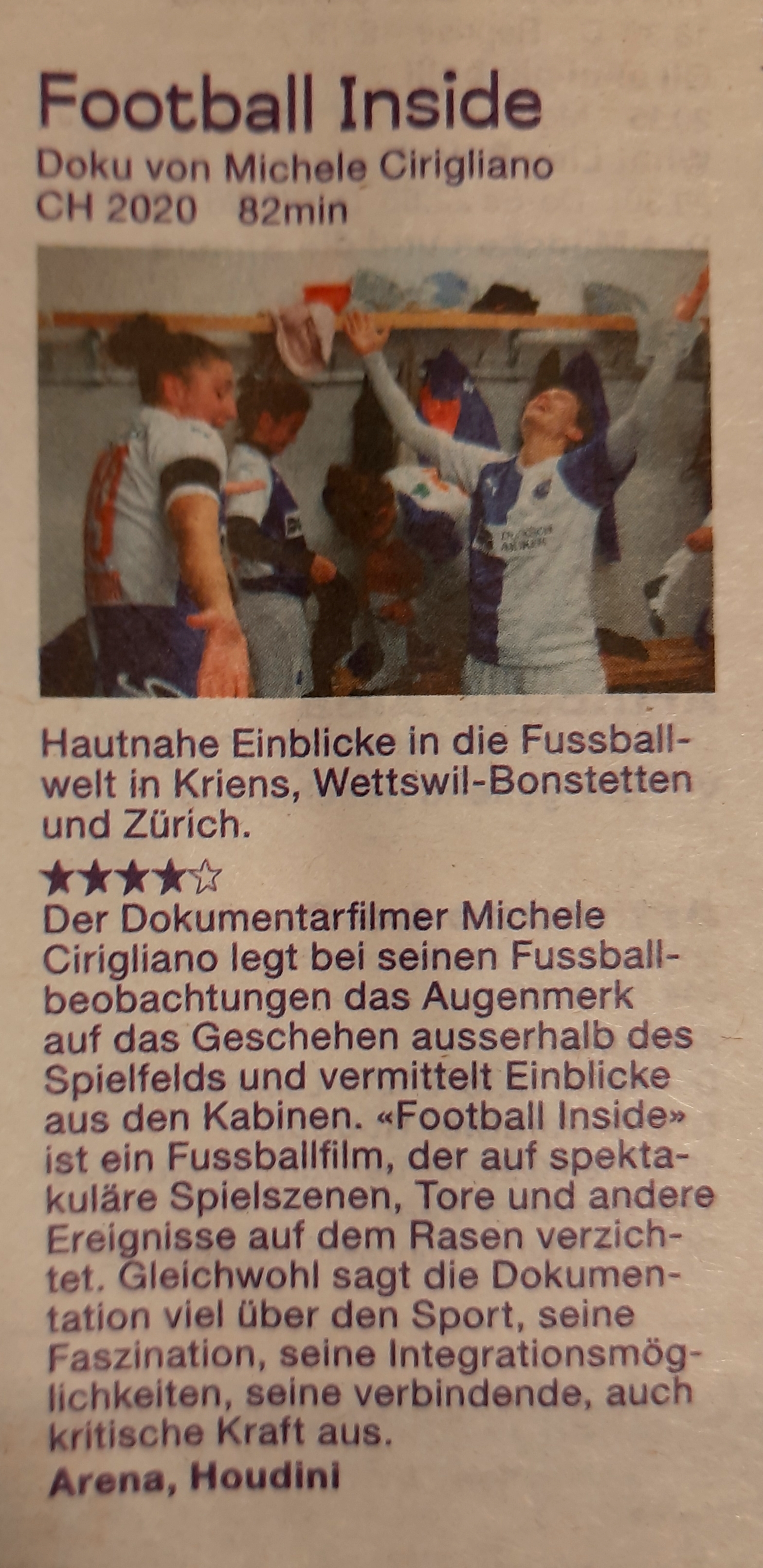 «FOOTBALL INSIDE ist ein Fussballfilm, der auf spektakuläre Spielszenen, packende Tore und andere Ereignisse auf dem Rasen verzichtet. Gleichwohl sagt die Dokumentation viel über den Sport, seine Faszination, seine Integrationsmöglichkeiten, seine verbindende, auch kritische Kraft aus.»